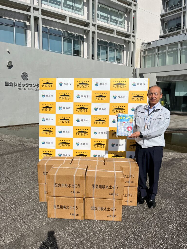 本年8月の大雨で被害を受け、復旧途上にある霧島市に、今後の被害防止に役立ててもらうために、緊急用吸水土のう525枚を寄贈しました。