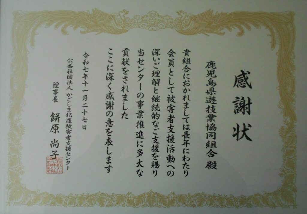 鹿児島県遊技業協同組合では、社会に貢献できる様々な活動に取り組んでおりますが、長年にわたる犯罪被害者に対する支援活動が認められ、「公益財団法人 かごしま犯罪被害者支援センター」から感謝状を授与されました。